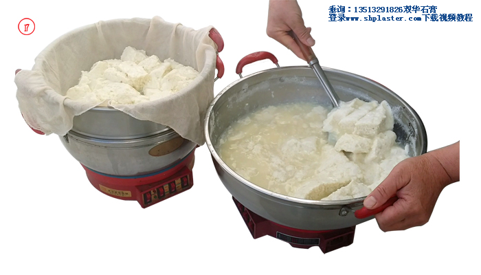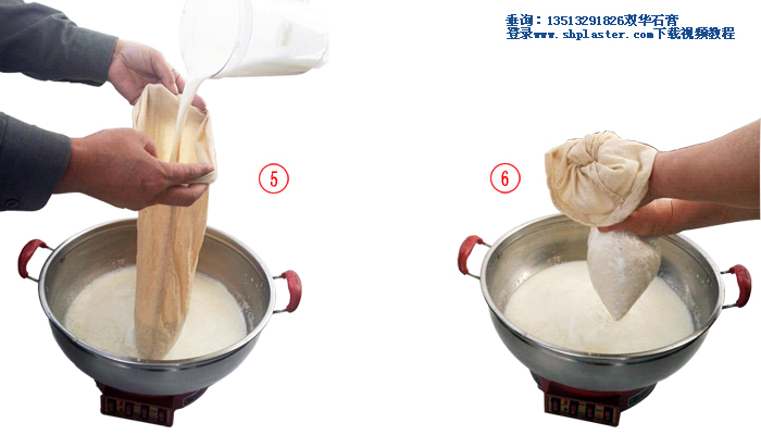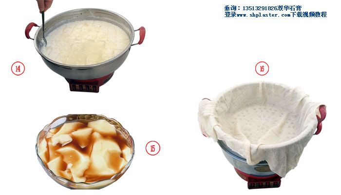 步驟12: 激烈攪拌煮開的豆?jié){,與此同時把石膏漿倒入豆?jié){中,此時豆?jié){的溫度大約在96℃左右。(溫馨提示:豆?jié){溫度越高,所用的食品級點石膏粉的數(shù)量越少,反之則食品級點石膏粉用量越多。如果豆?jié){溫度降到85℃時,食品級點豆腐石膏粉的用量要增加到每100克干黃豆,4克食品級點豆腐石膏粉。)